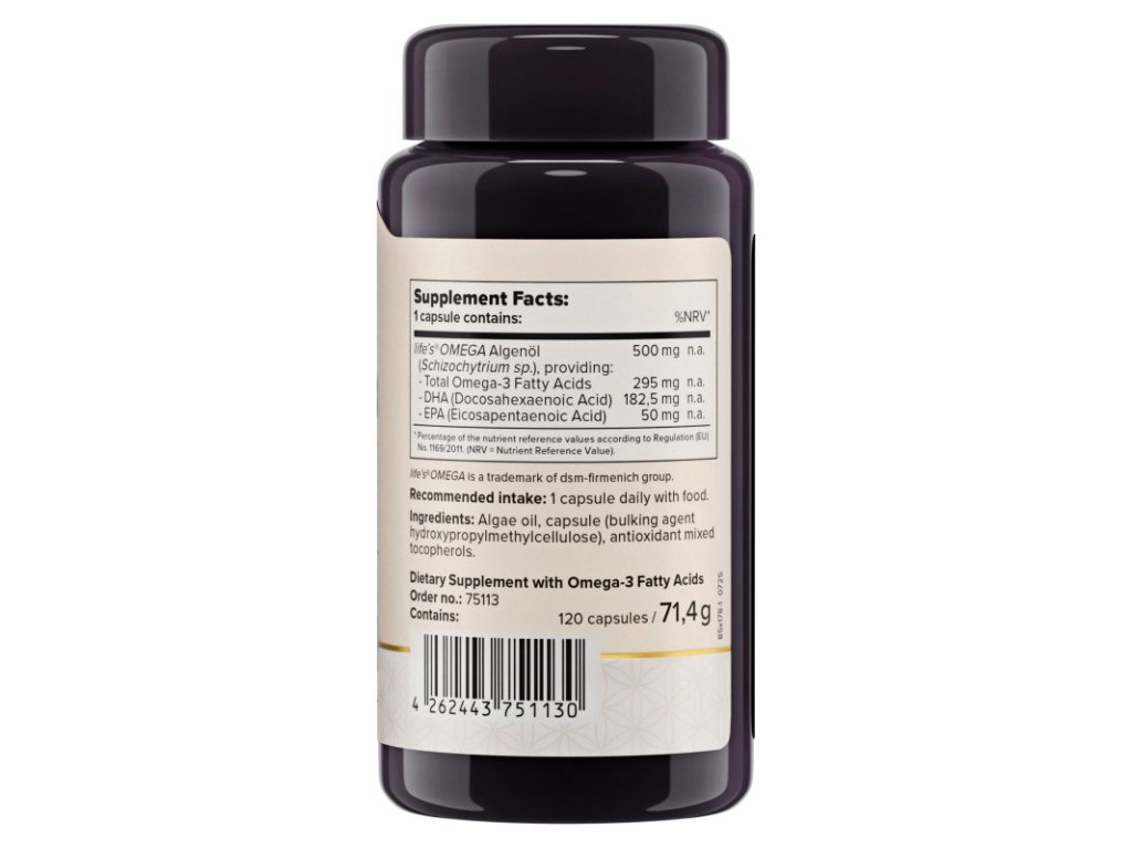 Zloženie: life's®OMEGA olej z rias (Schizochytrium sp.) 500 mg, celkové omega-3 mastné kyseliny 295 mg, DHA (kyselina dokosahexaénová) 182,5 mg, EPA (kyselina eikozapentaénová) 50 mg.